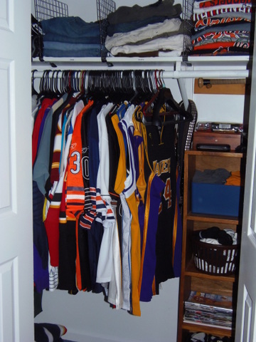 on one side of the closet hang all of his jerseys/nice shirts/sweatshirts |