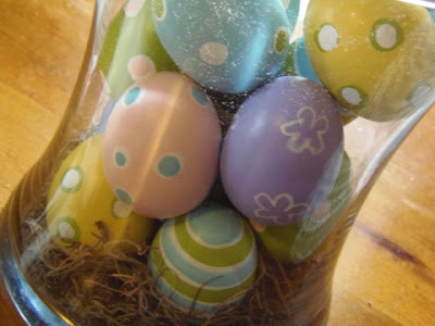 I bought some cute fabric covered eggs at Hobby Lobby to put in the glass cylinder on the kitchen table.