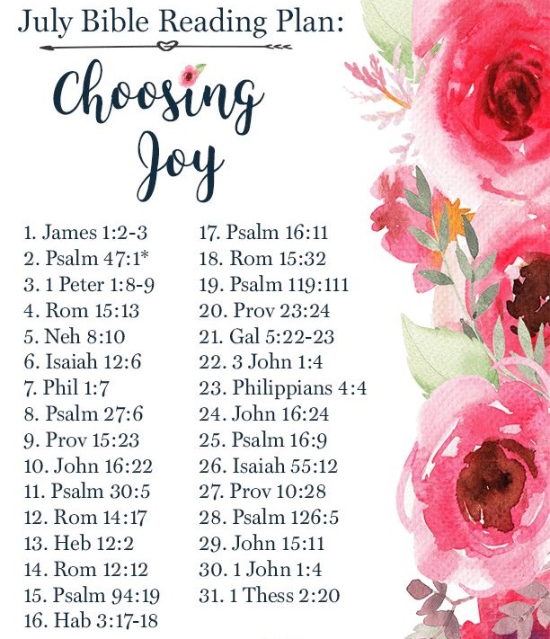 I started another monthly bible reading plan along with my regular devotions and Bible reading. July's theme is Choosing JOY!
